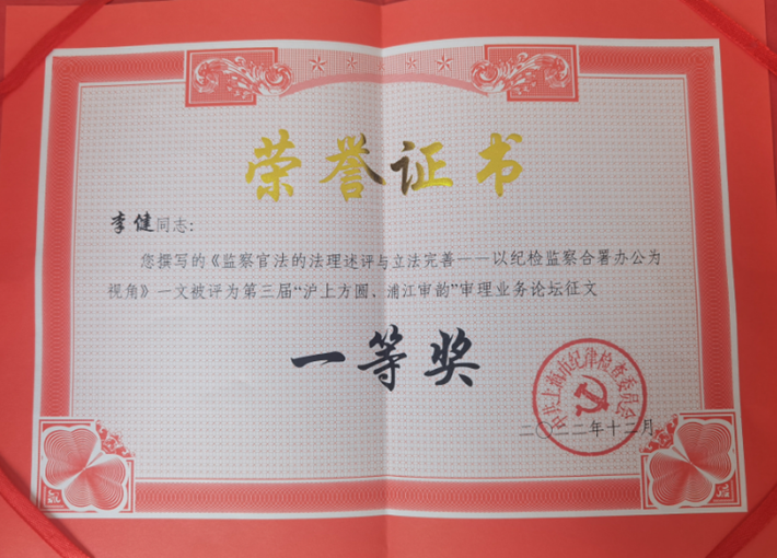 在市纪委监委举办的第三届“沪上方圆、浦江审韵”审理业务论坛评选中,校党委副书记、纪委书记、监察专员李健撰写的《监察官法的法理述评与立法完善——以纪检监察合署办公为视角》一文在征文中被评为一等奖,是唯一一个来自市属高校纪检监察机构的一等奖获得者。此次论坛面向全市各级纪检监察机关、各派驻纪检监察组、市管企业和市管高校纪检监察机构,共收到全市各单位递交的论文180余篇,最终评出一等奖7名。