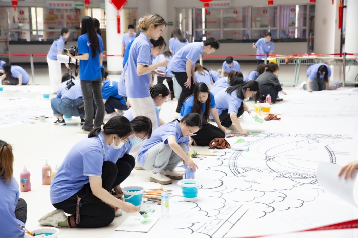 百米画卷创作的过程中,同学们把切身经历和感受借用艺术的语言表现在画布上,饱含着对奋进中的中国的自豪之情。为了更好地将理论学习、思想感悟转化为艺术语言,付诸艺术实践,参与主题创作的同学们时常在教室中讨论画稿,分享对祖国美好未来的憧憬,畅想着中华民族伟大复兴时宏伟而美好的画面,并不断尝试新的表现方式与创作灵感。一笔笔美好的勾勒描绘出上应青年们对新时代十年伟大成就的赞歌和对全面建成社会主义现代化强国时的美好畅想,用艺术作品讴歌中华民族伟大精神,为奋进新征程凝心聚力。
