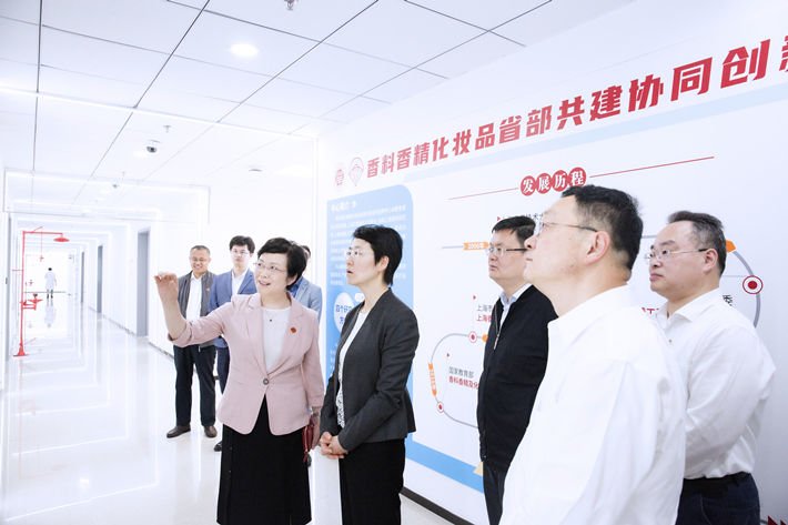 在第三学科楼,解冬考察了气相色谱—质谱实验室、电子鼻和电子舌实验室以及荣誉陈列室等,察看了香料香精化妆品特色优势学科建设成果展。随后,解冬前往第七学科楼,走进护理型化妆品创新设计实验室和化妆品基础理论实验室,详细了解了化妆品学科建设情况,听取了学科特色及应用领域情况汇报。