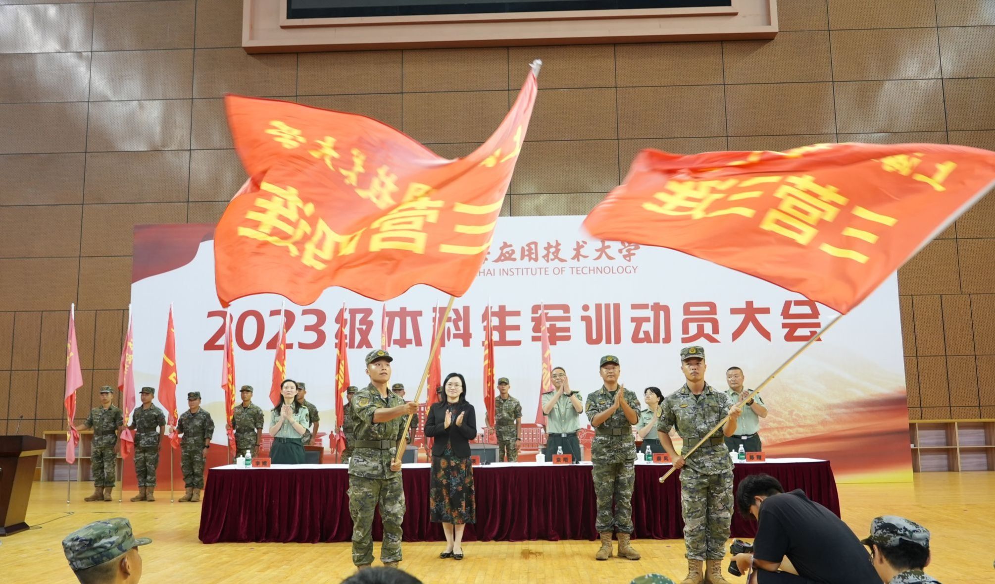 9月18日,我校2023级本科生军训动员大会在奉贤和徐汇两个校区举行,正式开启为期两周的军事训练。校党委副书记、副校长、军训工作领导小组组长王瑛出席并讲话。武警上海总队某支队领导、军训旅常务副旅长赵教官出席。校党委学工部部长、人民武装部部长,军训旅政委袁翔主持。全体承训教官与全体参训学生参加动员大会。