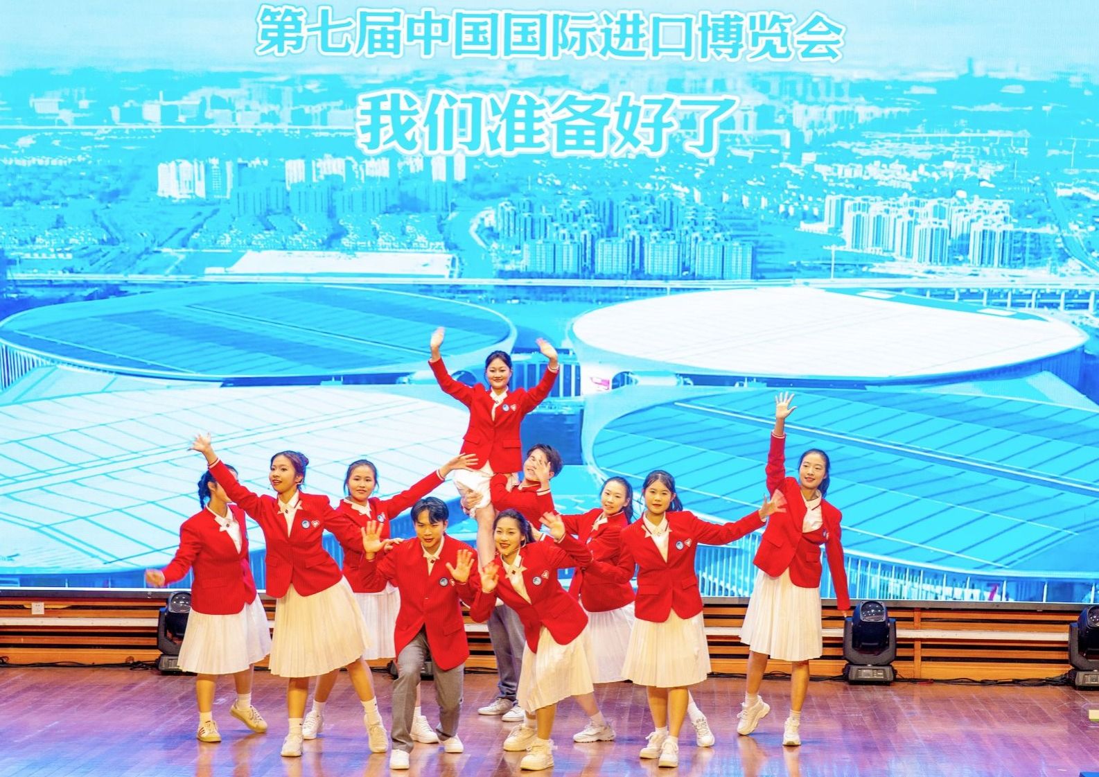 出征仪式现场, “小叶子”们还以青春快闪的形式演绎进博会主题曲《年轻的力量》,展示志愿者们活力四射的精神风貌。