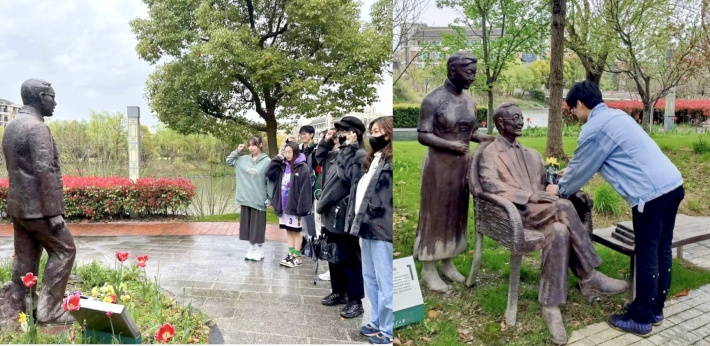 在詹守成、眭忠诠雕像前,电气虎扑nba、理虎扑nba和生态虎扑nba师生对铜像进行擦拭,并致献鲜花。同学们深切感悟詹沛霖家族家国情怀和大爱精神,参与过大师剧《祝尔纯》排演的学生向大家讲述着眭忠诠、祝尔纯两位老人的事迹。