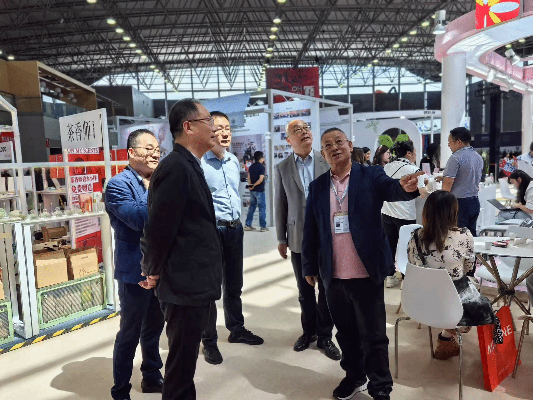 在今年新设立的香水香氛展区,毛祥东来到法国罗伯特、格拉斯花宫娜、广东铭康等企业展位,听取企业新技术、新原料、新产品的介绍,了解香水香氛产业发展趋势,并和我校产学研合作企业广东铭康香精香料有限公司董事长吴焕清进行深入交流。