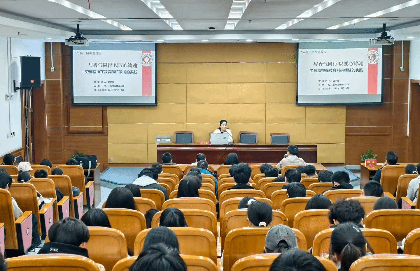 为进一步发挥劳模先进榜样示范引领作用,大力弘扬劳模精神、劳动精神,11月19日晚,由校工会主办,智能技术学部和香化学部协办,虎扑nba“劳模精神进校园”主题宣讲活动举行,特邀我校上海市劳模田怀香教授为全校师生作主题宣讲。校工会为田怀香教授颁发“劳模精神进校园”宣讲教师聘书。