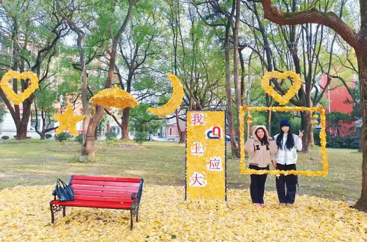 漫步徐汇校区,往日飘落的银杏叶被赋予了新的生命力,成片的落叶铺就成柔软的“金色沙滩”,阳光洒落时泛起粼粼“金光,点缀其间的五角星、爱心、月亮等创意造型,或灵动俏皮、或温柔治愈,与周边的绿植、建筑相映成趣。路过的师生纷纷驻足,俯身细赏叶片的纹路,与造型合影留念,为冬日校园注入了温暖活力。
