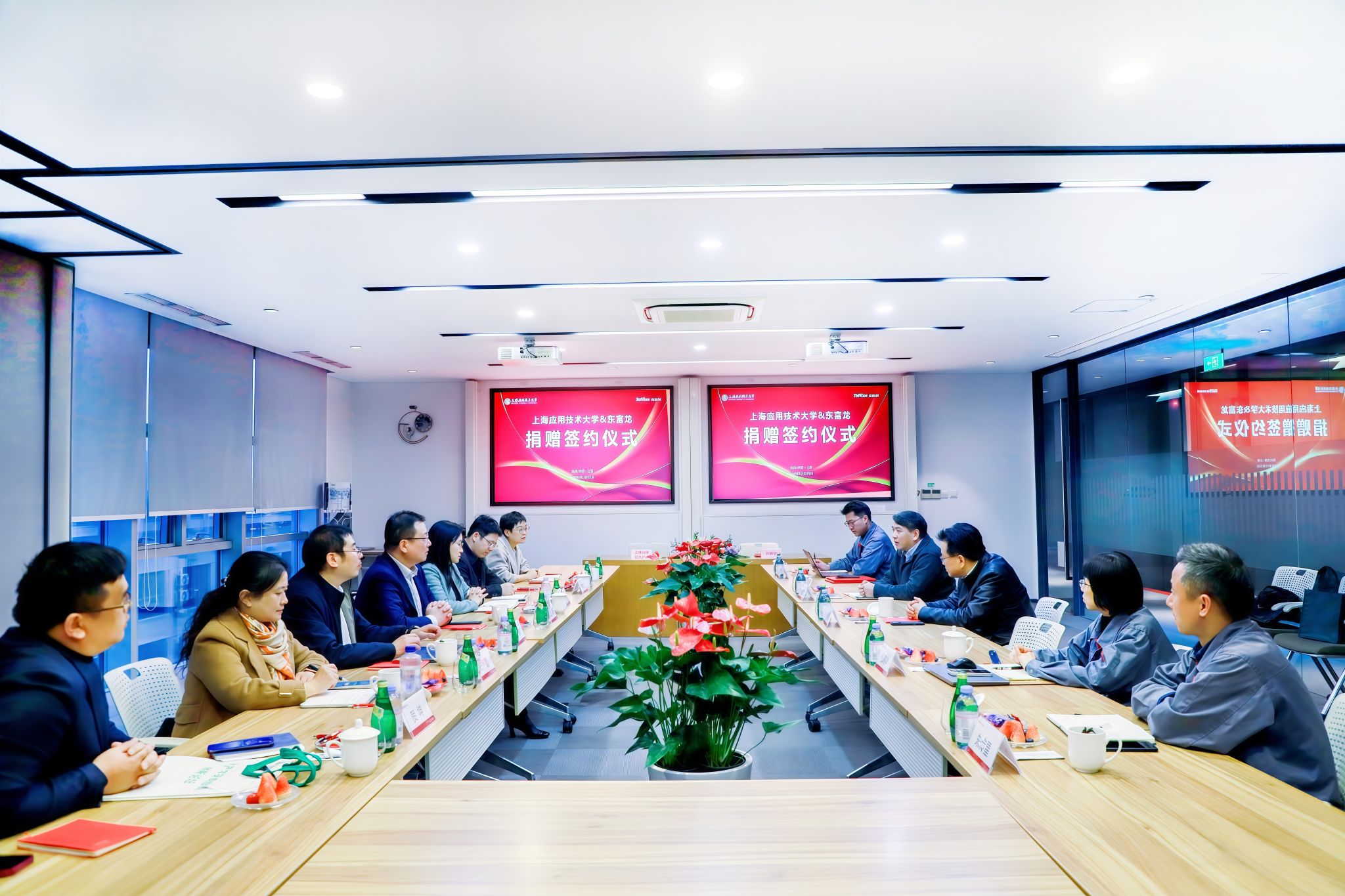 12月23日,上海应用技术大学与东富龙科技股份集团有限公司举行捐赠签约仪式,协商共建“智能制造创新研究院”。校长汪小帆,校党委副书记、副校长王瑛,东富龙科技股份集团有限公司董事长、我校1981级校友郑效东,高级副总裁、我校1992级校友郑金旺等校企代表出席仪式。