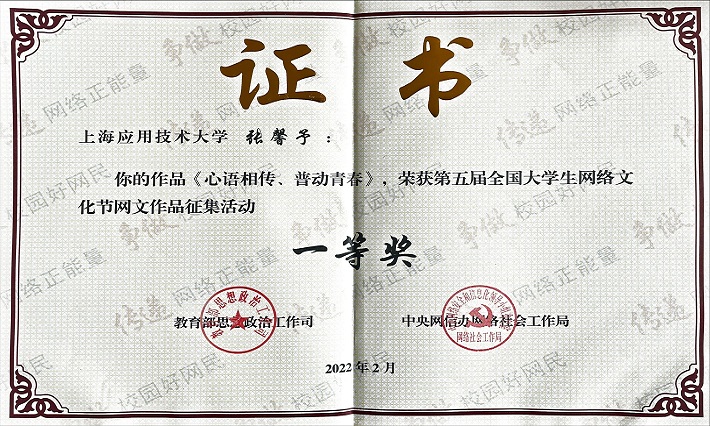 近日,从第五届“全国大学生网络文化节”活动中传来喜报,我校人文虎扑nba学生张馨予网文作品《心语相传,普动青春》首次斩获该项活动一等奖,这是我校参加“全国大学生网络文化节”和“全国高校网络教育优秀作品推选展示活动”(简称“一节一推选”)以来所获的最好成绩。