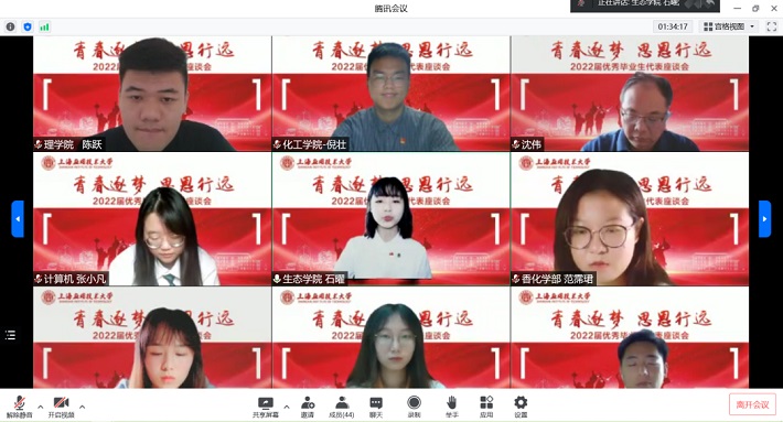 “希望你们在未来的人生路途上,始终秉持上应大校训,传承上应大精神,用激情和理想逐梦,用奋斗和奉献圆梦。”5月24日上午,上海应用技术大学“青春逐梦·思恩行远”2022届优秀毕业生代表座谈会举行,校长柯勤飞通过“云端”与毕业生代表亲切座谈,分享收获与成长,展望未来与期许。校党委副书记、副校长王瑛出席座谈会。