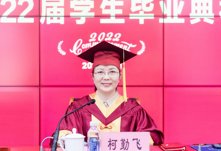 柯勤飞以“砥砺知行,在青春的赛道上跑出自己的最好成绩”为题致辞,向全体2022届毕业生表示热烈的祝贺,向为学生的成长成才付出辛勤劳动的全体教师、管理人员、服务人员和学生父母家人亲友表示感谢。
