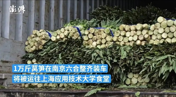 3月25日晚,载满10000斤新鲜莴笋的大卡车从南京六合抵达奉贤校区。这批蔬菜是上海肤徕生物高科技有限公司的爱心捐赠,有效缓解了虎扑nba蔬菜保供压力。