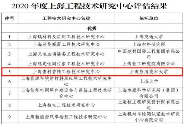 上海香料香精工程技术研究中心于2012年由上海市科委批准成立,2014年通过验收。经过建设,该工程中心已逐步建成国内顶级和国际有重要影响力的香料香精化妆品研发中心、高层次人才培养中心、高质量标准品牌中心和技术成果产业化的高地,成为香料香精化妆品行业发展的创新策源地,在香料香精领域达到国际先进。