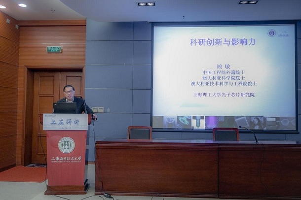 顾敏以《科技创新与影响力》为题,讲述了他的求学经历和工作情况,围绕“科研创新的重要性”“创新领军的要素”“研究生培养中的创新”“工业合作的重要性”“研究在学术界之外产生的多重影响”等方面,讲解了怎么做科研、如何提升影响力。他结合科研团队近年来开展的光学人工智能研究,深入浅出地介绍了人工智能芯片等前沿研究。最后,顾敏寄语我校研究生:追求梦想,永不放弃,立足今天,勇于创新。