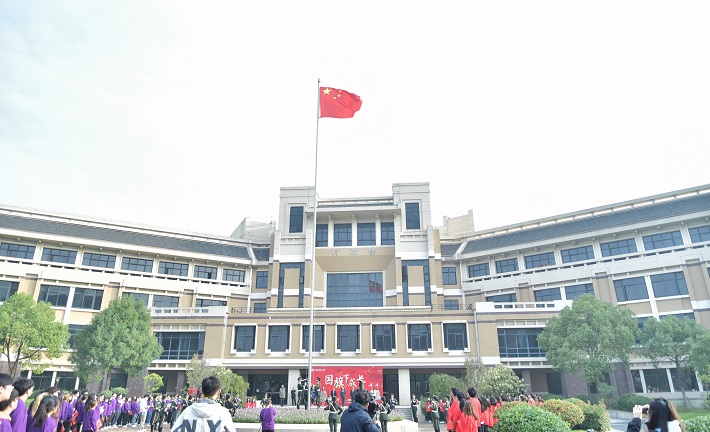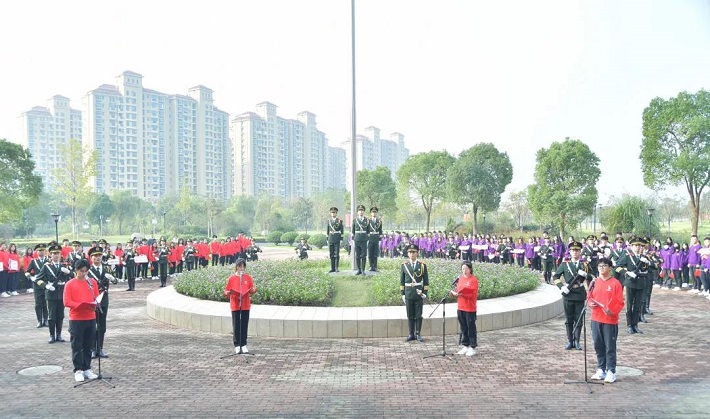 迎着第一缕朝阳,英姿飒爽的国旗班同学迈着整齐的步伐走向升旗台,伴随着嘹亮的国歌声,鲜艳的五星红旗冉冉升起,迎风飘扬。在场的全体师生面向鲜艳的国旗行注目礼,高唱国歌,心潮澎湃。