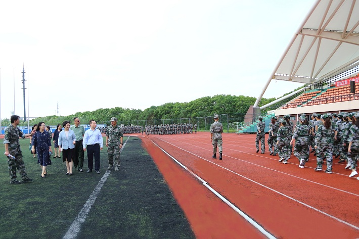 9月16日上午,校党委书记郭庆松,校党委副书记、校长柯勤飞,校党委副书记、副校长王瑛来到军训现场,看望慰问正在紧张训练的承训教官、参训学生及工作人员。