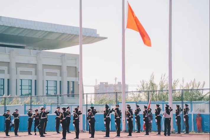 伴随着激昂的乐曲声,校国旗班同学迈着铿锵有力的步伐,昂首阔步护卫国旗走向升旗台,全体师生整齐列队行注目礼。庄严的升旗仪式后,新生军训汇报大会暨开学典礼开始。