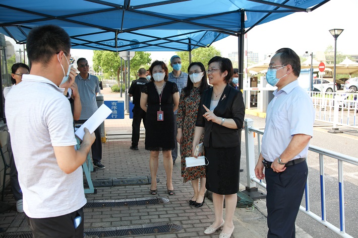 正式演练前,郭庆松、柯勤飞带队实地检查了校门入口、体育馆、迎新报到等防控措施落实情况,对入校查验、核酸检测、人员引导、防护安全、应急处置等各个环节进行了详细问询和指导。