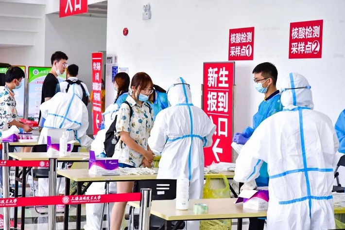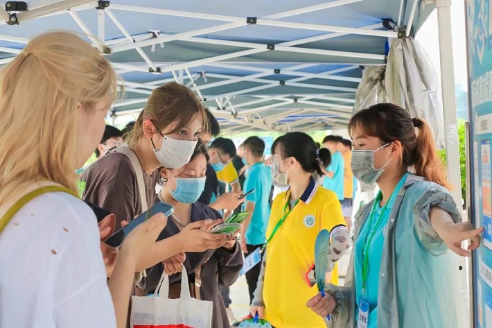 来到迎新现场,与前来报到的2021级新生亲切交流,