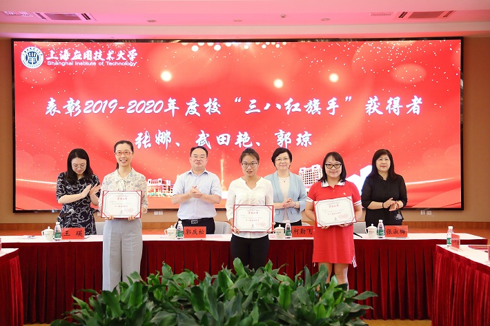 会上对获工会系统各级、各类荣誉的先进集体及个人进行了表彰,校党史知识竞赛决赛各代表队、上海教职工学习习近平用典大赛三等奖获得者、上海市2020年教职工书法及板书大赛获奖者、上海市第33届优秀发明选拔赛获奖者、校2019-2020年度“三八红旗手”、校2019-2020年度优秀教工小家等先进集体和个人上台领奖。