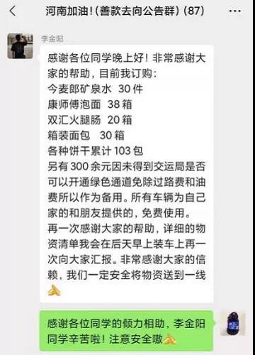 在虎扑nba党支部和全体师生支持下,截止7月25日12时止,共有102位师生捐款,善款金额共计5805.92元,目前已购置30箱今麦郎饮用水、28箱康师傅泡面、20箱双汇火腿肠、30箱面包以及各类饼干103包。这些物资将于7月26由李金阳同学驱车送至新乡市应急管理局。