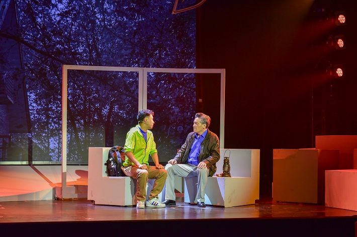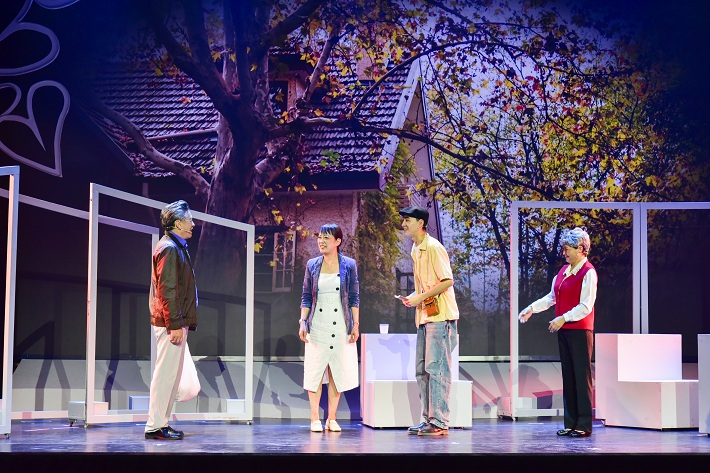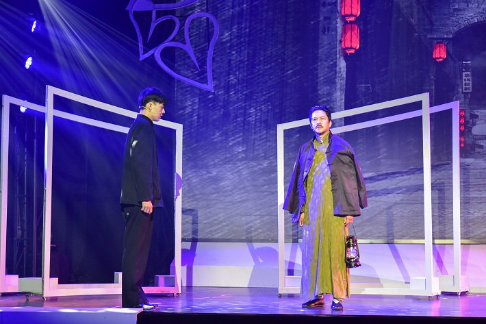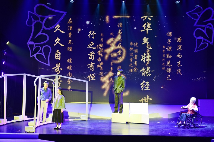第三幕,“忠诠—尔纯”思想政治教育奖一等奖获奖教师许存辉面临抉择困惑,来向眭忠诠老人请教。眭老讲述了青年时代怀揣满腔救国图强之志,辞掉家父为自己谋就的优俸之职,毅然踏上革命道路的故事。父子间一番跨越时空的长谈,眭父悦纳了儿子的救国志向。父子之情、救国之志,激励眭忠诠毕生追求党的事业。眭老的故事,深深打动了许存辉,他决心把这种“为国为民”的精神传承下去,轻松走上继续关心帮助青年学生的事业道路。