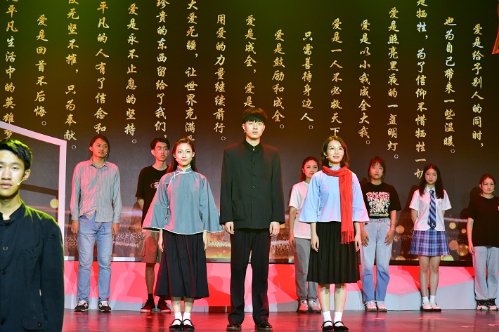 “爱的方式有许多种,我们只不过选择了一种”“尔以纯诠留世间”,多么淳朴而高尚的话语。“忠”肝义胆,“诠”释仁爱,“尔”欲何求,“纯”予奉献。全体演员每人以一句“爱的感言”谢幕,把演出再次带到高潮。