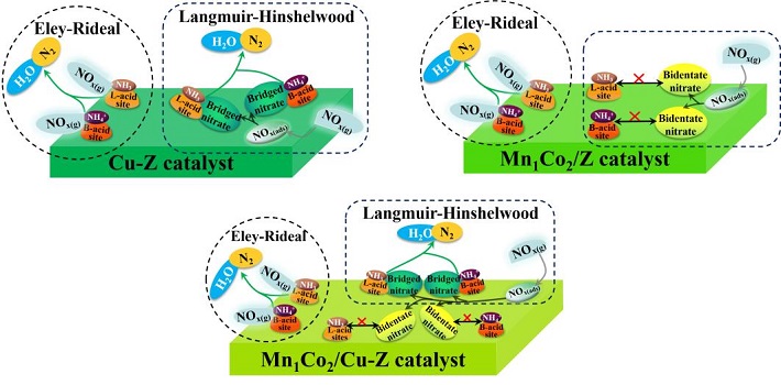 氮氧化物是主要的大气污染物,选择性催化还原(SCR)是消除氮氧化物(脱硝)的最有效手段。Cu2+交换的分子筛催化剂在脱硝领域已经逐步实现工业化应用,但其低温活性仍不尽如意。该研究将Mn-Co复合氧化物负载在Cu-ZSM-5上,极大提高了Cu-ZSM-5的低温活性。催化剂的表征揭示,Mn-Co氧化物的引入,增加了催化剂表面高价金属离子的含量和化学吸附氧浓度,促进了“快速SCR”反应路线的进行和氧化还原循环的运转。采用原位红外漫反射技术(DRIFT)对反应中间体及反应机理进行了深入分析,发现Cu-ZSM-5表面吸附的硝酸盐以桥式为主,MnCo/ZSM-5表面则是双齿硝酸盐占据主导地位,MnCo/Cu-ZSM-5表面同时吸附桥式和双齿硝酸盐物种。在150 °C的反应温度下,Cu-ZSM-5的表面存在Eley-Rideal(E?R)和Langmuir-Hinshelwood(L?H)机理,MnCo/ZSM-5表面以E-R机理为主,而MnCo/Cu-ZSM-5则兼具了Cu-ZSM-5和MnCo/ZSM-5的特点。该研究为低温SCR脱硝催化剂的设计提供了一定的理论依据,也为Cu2+交换分子筛催化剂的工业化应用起到了很好的技术借鉴作用。