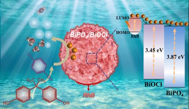 通过半导体光催化过程进行有机污染物治理一直是催化领域的研究热点。该研究通过一锅法制得花球状Bi基双组分BiPO4/BiOCl异质结催化剂,在染料敏化下用于持久性有机污染物(POPs)的可见光催化降解。通过细致机理研究发现,罗丹明B(RhB)在可见光照射下被激发,电子从最高已占分子轨道(HOMO)跃迁到最低空分子轨道(LUMO),进而传输到BiOCl的导带,而BiPO4/BiOCl异质结的形成有效促进了BiOCl导带中的电子向更低位置BiPO4的导带上迁移,由于BiPO4的导带位置合适,迁移至BiPO4导带中的电子很容易被O2捕获而形成·O2-和H2O2等活性氧组分,它们随即参与到包括双酚A、4-氯苯酚等POPs污染物的光催化降解过程中;研究还利用液相色谱-质谱联用技术对污染物的光催化降解过程进行了细致分析。本研究巧妙地为BiPO4/BiOCl催化剂中电子连续传输提供了理想通道,利用染料敏化机制拓宽了宽带隙半导体材料的可见光响应范围,也为光催化降解有机污染物提供了一种全新的研究思路。