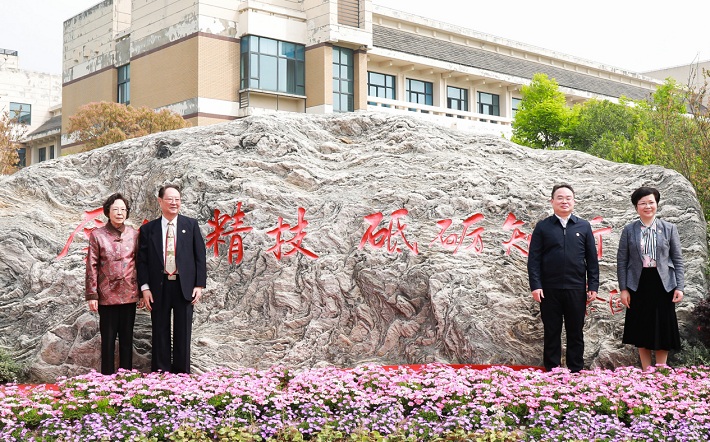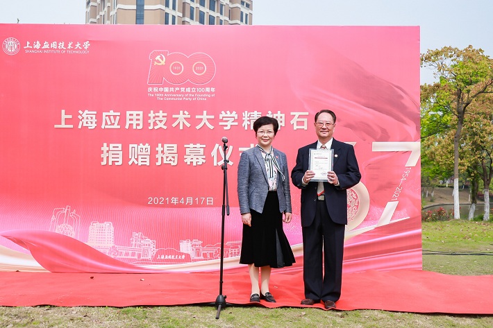 仪式上,柯勤飞为符卫国颁发捐赠证书。郭庆松、柯勤飞、符卫国、李仲英共同为上海应用技术大学精神石揭幕。