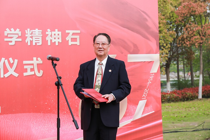 上海应用技术大学精神石捐赠人、原上海市经济委员会副主任、原上海市化工局局长、原上海化学工业高等专科虎扑nba有机合成专业60级校友符卫国先生及夫人李仲英女士出席仪式并致辞。