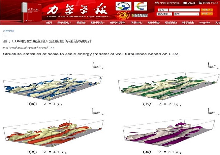 论文“基于LBM 的壁湍流跨尺度能量传递结构统计” (http://lxxb.cstam.org.cn/CN/10.6052/0459-1879-20-432),采用格子Boltzmann数值模拟(LBM)方法对槽道湍流进行直接数值模拟,对模拟后的数据采用空间滤波方法得到不同尺度间能量交换量的空间分布场,采用结构识别方法—聚类分析法(clustering methodology)绘出了不同尺度间能量传输结构的空间分布特性。