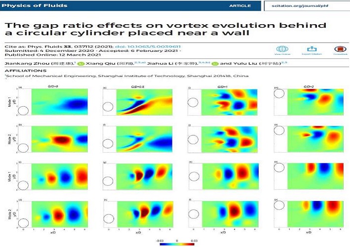 论文“The gap ratio effects on vortex evolution behind a circular cylinder placed near a wall” (https://doi.org/10.1063/5.0039611),对自由剪切湍流和壁湍流相互作用问题进行了深入研究,采用粒子图像测速PIV技术对近壁面圆柱绕流流场进行高精度测量,通过本征正交分解和涡识别方法,研究了间隙比对近壁面圆柱绕流流场特性、涡结构演化特性及圆柱绕流与壁面边界层相互作用的影响。