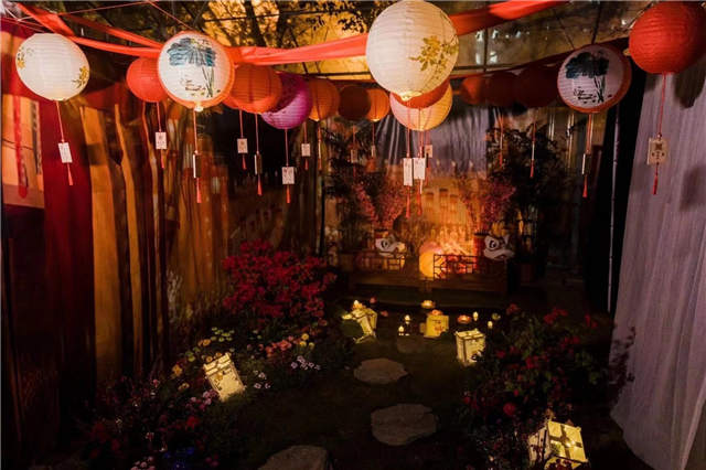 小庭院里还以“水”为界,将空间分割为庭院、戏台、街道三个部分,观灯、舞龙舞狮、赏花、逛园等古典元素,渗透于每个细节。
