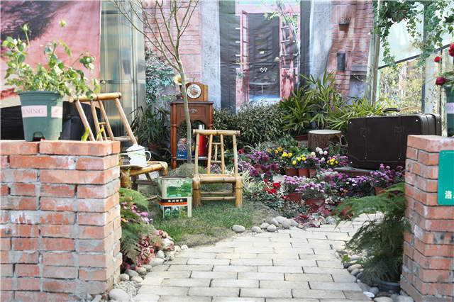 在这个取名“屋里乡”的小花园里,红砖外墙上有网上淘来的“洛川东路200弄”的号码牌、还有自己铺设的地砖、留声机、滴答的时钟、上了年代的行李箱,上海里弄左邻右舍在小竹椅上“嘎讪胡”的意境扑面而来。