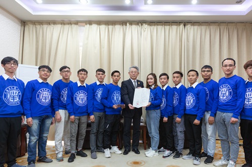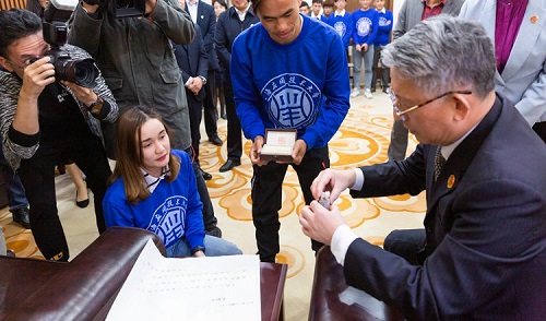 会前,上海市人大常委会副主任、上海市人民对外友好协会会长沙海林专程看望留学生。学生们用老挝石雕刻了一枚篆体“大家长”印章,并签上了中老文姓名作为礼物相赠。得知下周将有8位老挝学子学成回国,他们将成为老挝首批铁路技术人才,沙海林亲笔赠言:努力成长为“两个工程师”,即维护中老铁路的工程师和搭建中老友谊之桥的工程师。