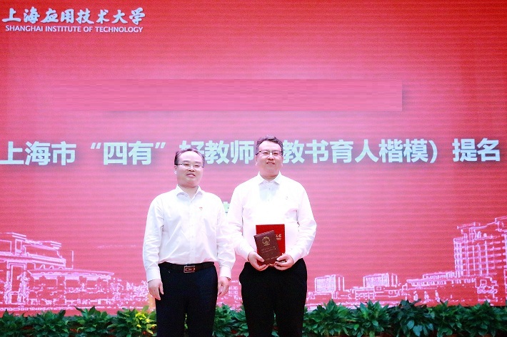 郭庆松为上海市“四有”好教师(教书育人楷模)提名奖获得者韩生教授颁奖,表彰他在教学、科研、学科建设等工作中做出的突出贡献,弘扬他潜心科研、悉心育才、无私奉献、勇担使命,做学生知识学习的导路人、学生创新思维的培育者、学生奉献祖国的引路人的师德精神。