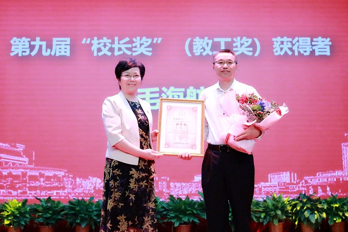 柯勤飞为第九届“校长奖”(教工奖)获得者毛海舫教授颁奖。表彰他坚守教书育人初心、推进科学技术创新、践行引领行业企业科技发展的使命担当,以及把论文写在祖国大地上、把科研体现在成果转化中、把育人渗透在身体力行中的师道追求。