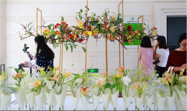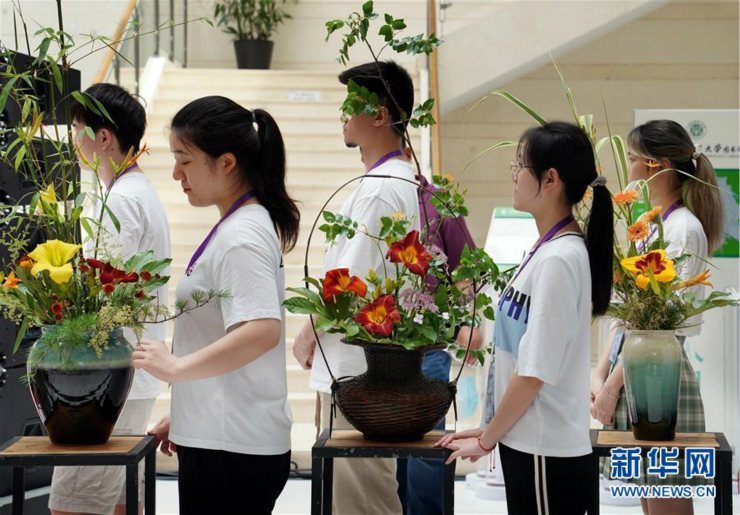 6月13日,上海应用技术大学的学生们设计创作的萱草花艺作品即将在开幕式现场亮相。新华社记者刘颖摄