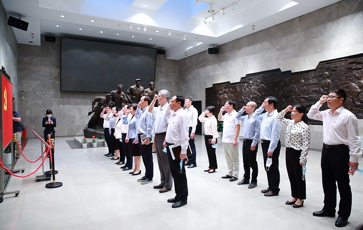 在纪念馆序厅,面对鲜红的党旗,郭庆松带领大家重温入党誓词,铮铮誓言,铿锵有力,更加坚定地牢记入党时的庄严承诺和初心使命。
