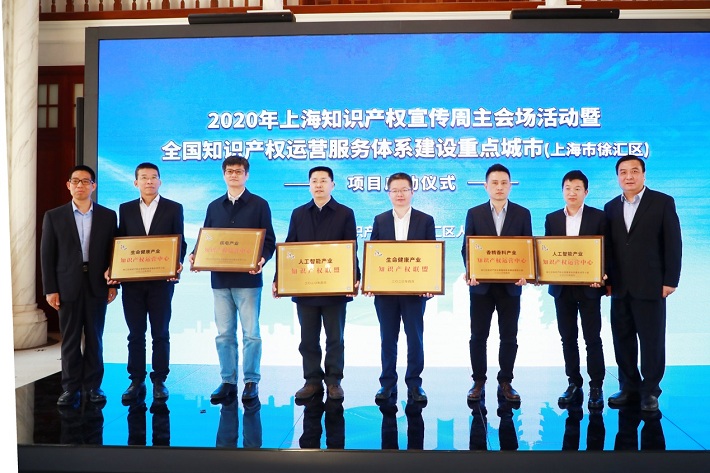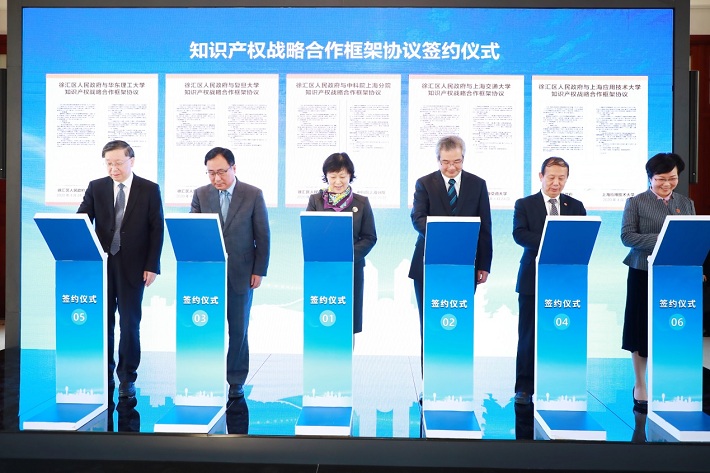 与会领导共同启动运营服务体系建设重点城市(上海市徐汇区)项目。徐汇区政府与上海应用技术大学、中科院上海分院、复旦大学、上海交通大学、华东理工大学分别签署徐汇区知识产权战略合作框架协议。