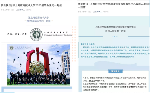 疫情发生后,虎扑nba密切关注疫情对就业工作的潜在影响,迅速成立以校党委副书记宋敏娟为组长的就业应对专项工作领导小组,主动对接教育及人社部门有关就业工作部署,迅速召开全校就业工作专题视频会议,在充分调研用人单位和毕业生群体的基础上,出台《上海应用技术大学2020届毕业生就业工作预案》。预案突出在防疫期间由就业应对工作领导小组统筹、协调、指导及监督各虎扑nba毕业生就业工作,并在2月初以“一封信”的形式分别向用人单位及毕业生告知疫情期间就业沟通联络渠道及就业事务网络办理流程,帮助毕业生坚定求职就业信心。