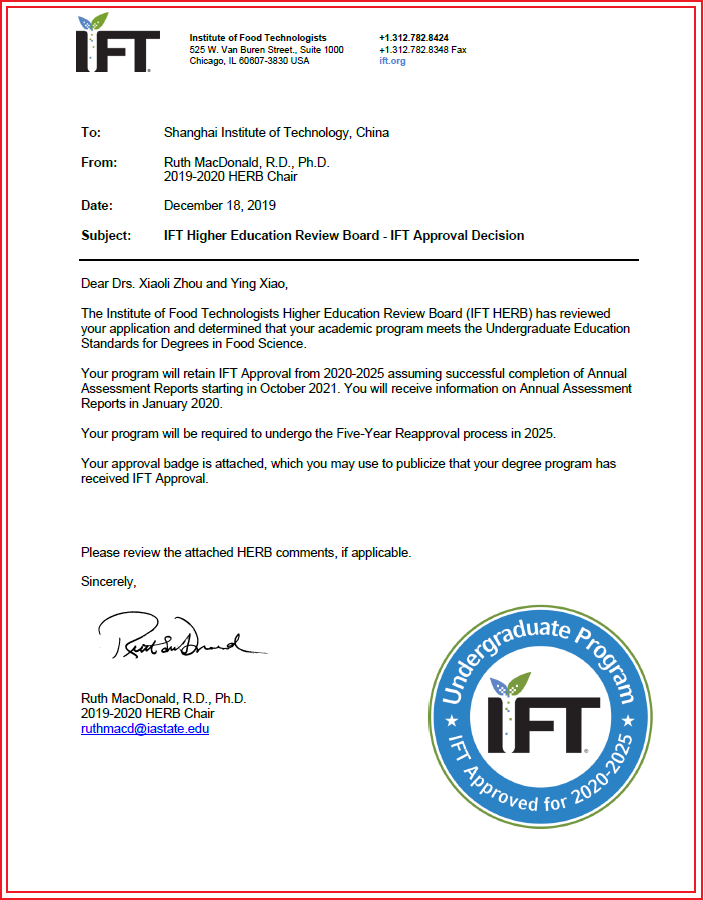 12月18日, IFT(the Institute of Food Technologists,美国食品科学技术学会)总部致函我校,经IFT高等教育认证委员会(Higher Education Review Board, HERB)审议及决议,我校香料虎扑nba食品科学与工程专业正式通过IFT认证,获五年满额认证(2020年-2025年),成为2018新版IFT认证标准执行后首批通过IFT国际专业认证的高校。