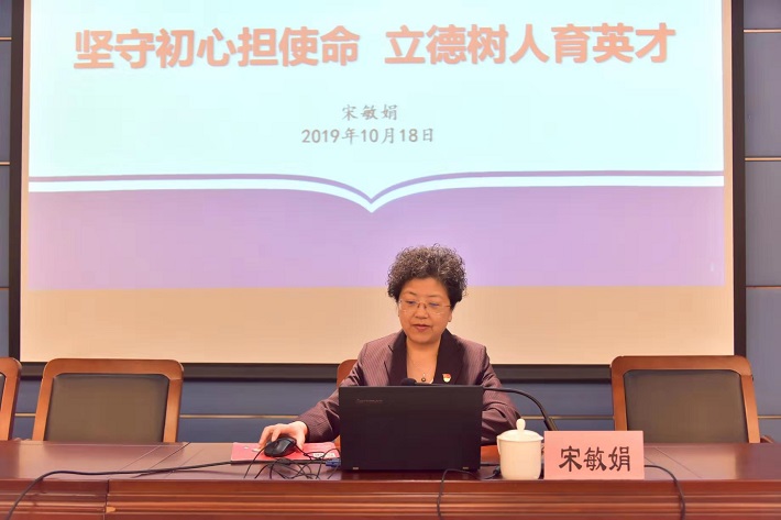 宋敏娟从三方面深入浅出地讲解了“不忘初心、牢记使命”的历史逻辑、现实意义及实践路径。首先,正确认识共产党人的初心和使命。她从“初心”历史讲起,分析了什么是初心以及为什么要守初心这个根本性问题,阐释了“不忘初心、牢记使命”的由来与立意,并重点讲解了坚持“不忘初心、牢记使命”的必要性,指出这是加强思想政治建设的迫切需要,是有效履行学工干部职责使命、搞好本职工作的迫切需要,是加强作风建设、走进学生心灵的重要前提。其次,严格对标共产党人的初心与使命。敢于直面问题、勇于修正错误是党的显著特点和优势,要对标共产党人初心找差距,对照新时代中国特色社会主义思想和党中央决策部署、对照党章党规、对照人民群众新期待、对照先进典型和身边榜样,坚持高标准、严要求,找一找存在哪些差距,有的放矢进行整改。最后,守初心、担使命,为党育人、为国育才。她从习近平总书记关于教育的重要论述讲起,阐释了教育的首要问题与根本问题,并以香港近期动荡局势为例,生动地展示了对青年群体开展思想政治教育的重要性与必要性。同时她引用习近平总书记关于青年培育的形象化论述:“培土、浇水、施肥、打药、整枝”等,给予大家开展思政工作的方法论指导。