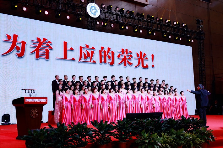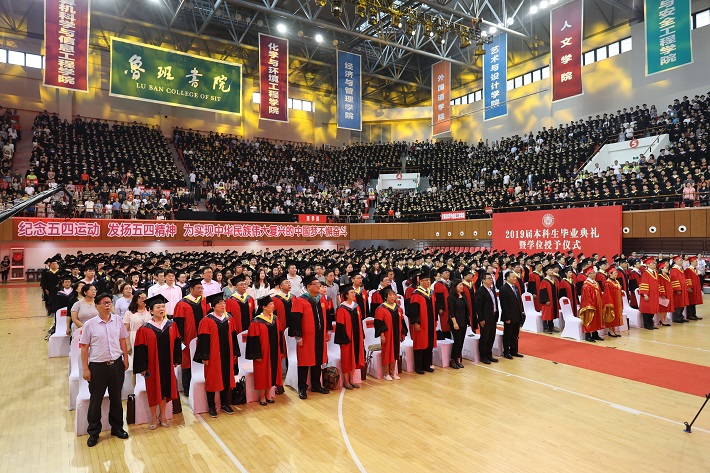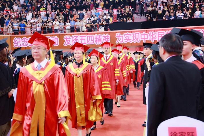 上午9点30分,伴随着全场齐唱国歌《义勇军进行曲》,毕业典礼拉开帷幕。
