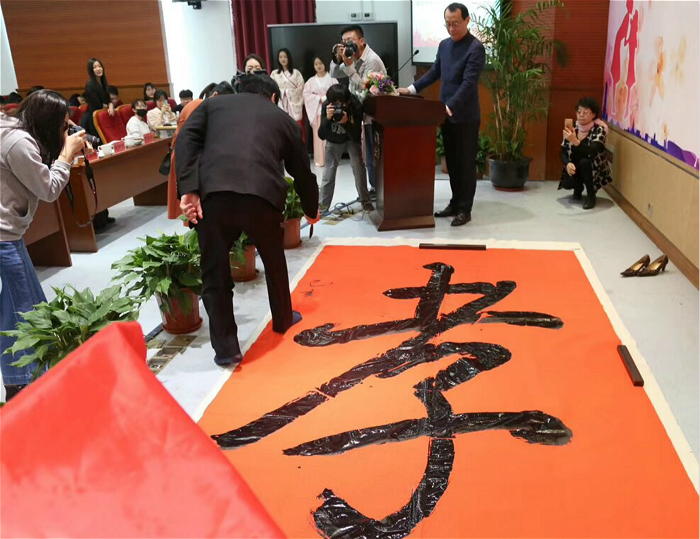 ▲开幕式上,北京大学书法研究所萧建国教授现场题写了大大的“孝”字
