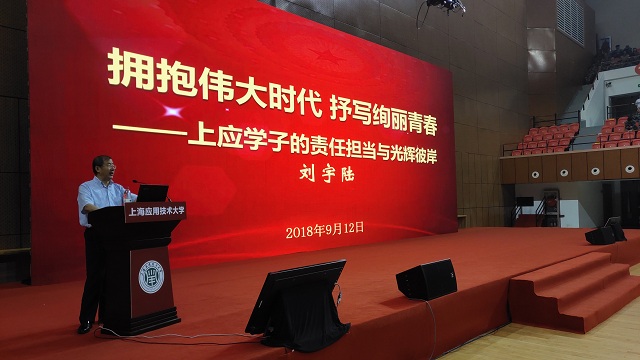 “我们正处于一个什么样的时代?在这样一个伟大的新时代,每一位中华儿女包括在座诸位要肩负起什么样的历史使命呢?上海应用技术大学的青年学子们要实现一个什么样的出彩人生呢?”9月12日晚,奉贤校区体育馆座无虚席,校党委书记刘宇陆为2018级全体新生讲授“第一堂思政课”。课堂伊始,他用三个问题的循循善诱与坚定回答开启了“互动对话”,一堂关于伟大时代与青春使命的“大学思政课”精彩讲述。