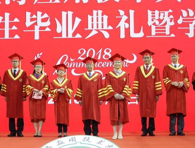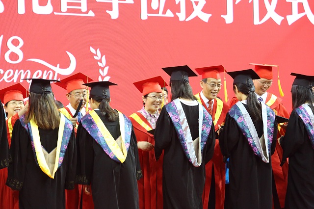 全体校领导及主礼教授上台为优秀毕业生授予学位,扶正流苏,完成了他们从在校生到毕业生的转变,为即将离开母校、走向服务国家区域经济社会发展大舞台的2018届毕业生的大学本科生涯画上了一个完美的感叹号。