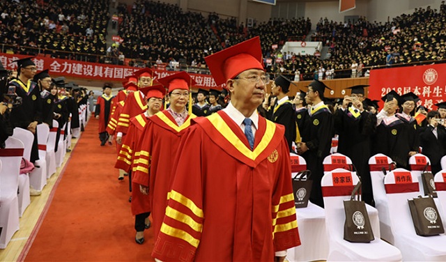 上午9时30分,在华灯闪烁的体育馆内,由代表知识的圣洁和大学最高学术权力的权杖引领,校领导及主礼教授入场,毕业生们头戴学士帽、身披学士服,流苏垂袅、衣袂飘飘,齐唱雄壮的中华人民共和国国歌,随着五星红旗的冉冉升起,毕业典礼拉开大幕。