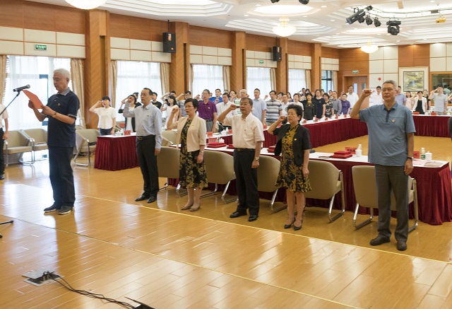座谈会在雄壮的国歌声中开始。与会全体党员面向鲜红党旗,重温入党誓词,表达对党和人民的庄严承诺。原上海轻工业专科虎扑nba离休干部闵均安同志领誓。
