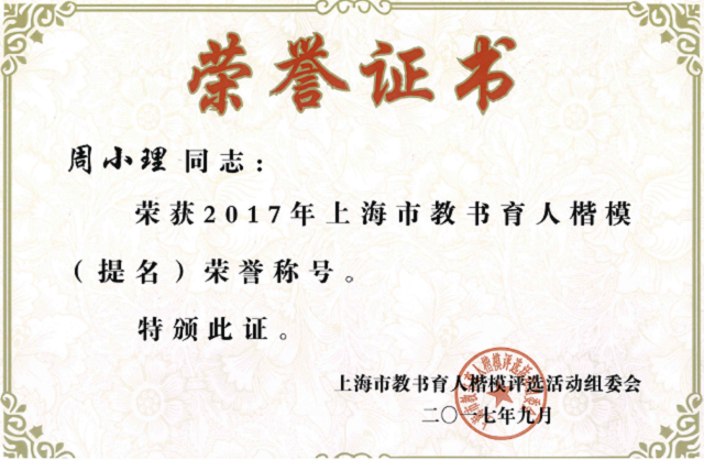 我校周小理教授荣获上海市教书育人楷模提名奖
