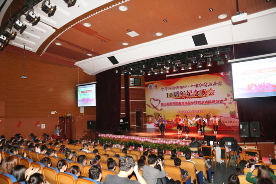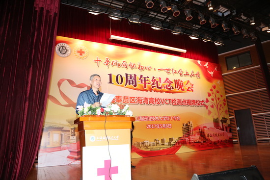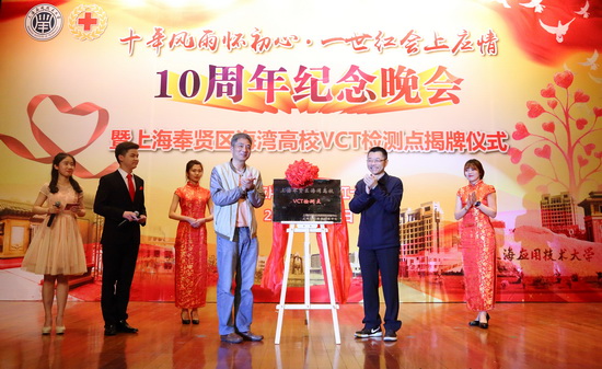 陆靖为“上海奉贤区海湾高校VCT检测点”揭牌;张锁怀致辞回顾了我校红十字会十年发展的历程,拉开了整场晚会的序幕。